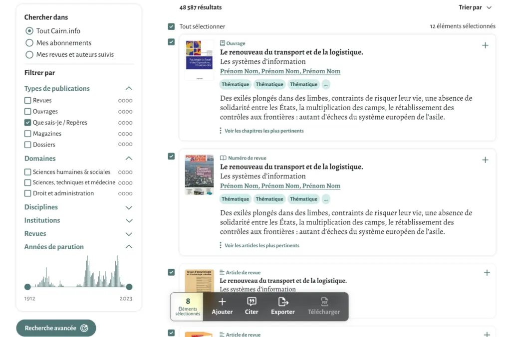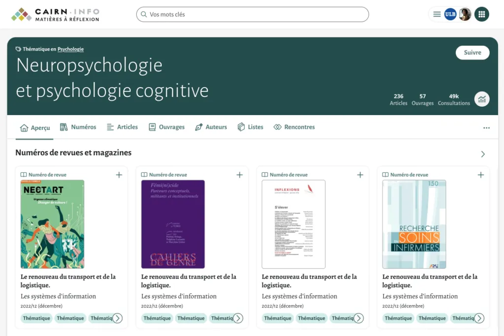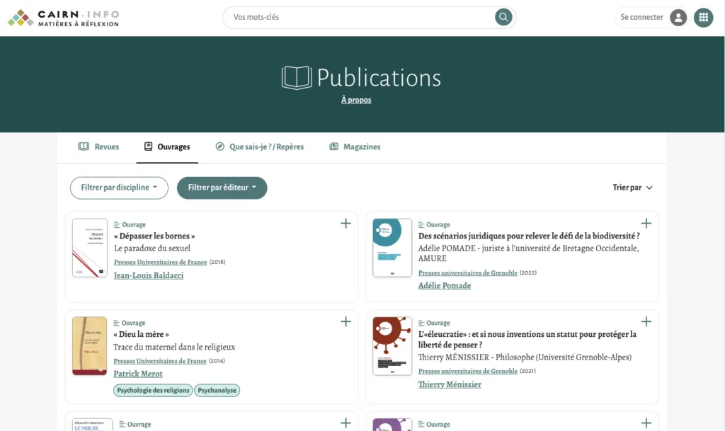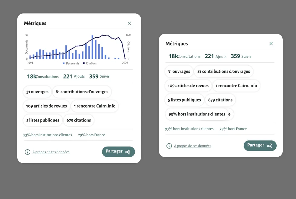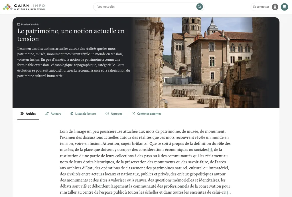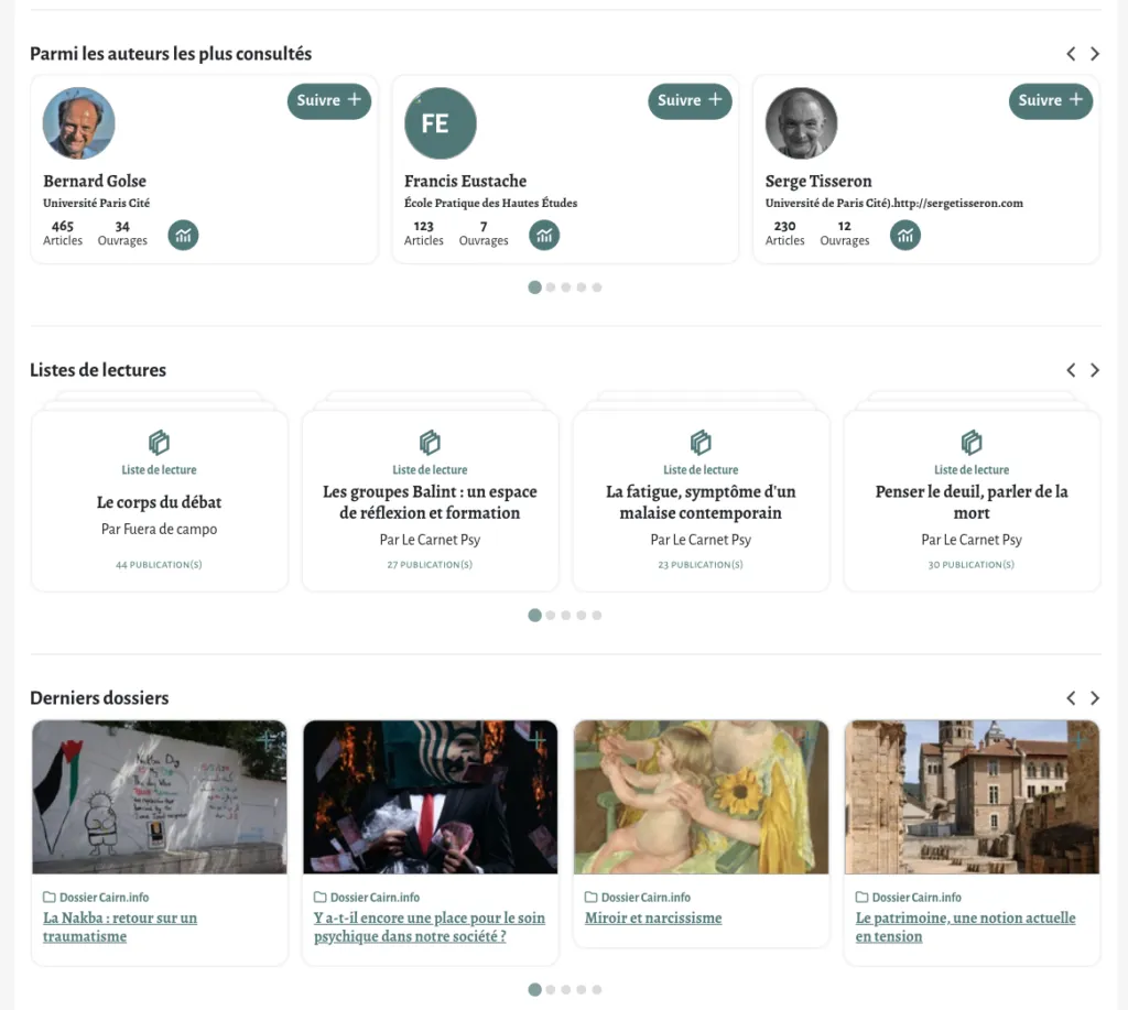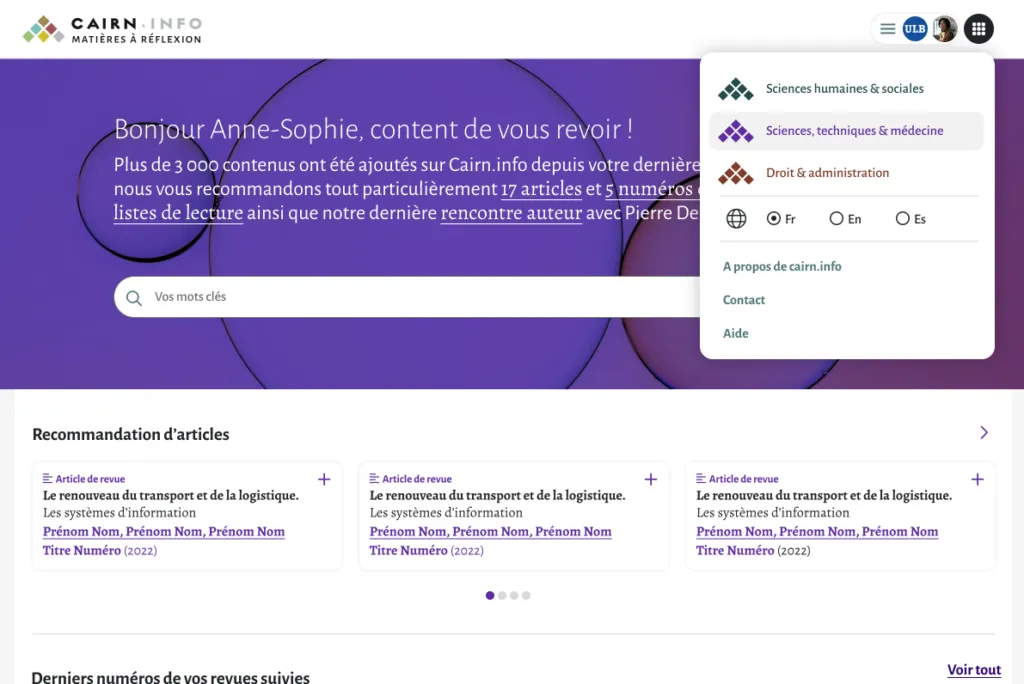 Nos équipes travaillent actuellement sur une évolution majeure de notre site, prévue mi-2024. Il s'agit d'un projet conséquent, qui impactera sans aucun doute l'expérience de Cairn.info, et sur lequel nous travaillons d'ailleurs en étroite collaboration avec un panel d'utilisateurs et utilisatrices particulièrement engagé(e)s.